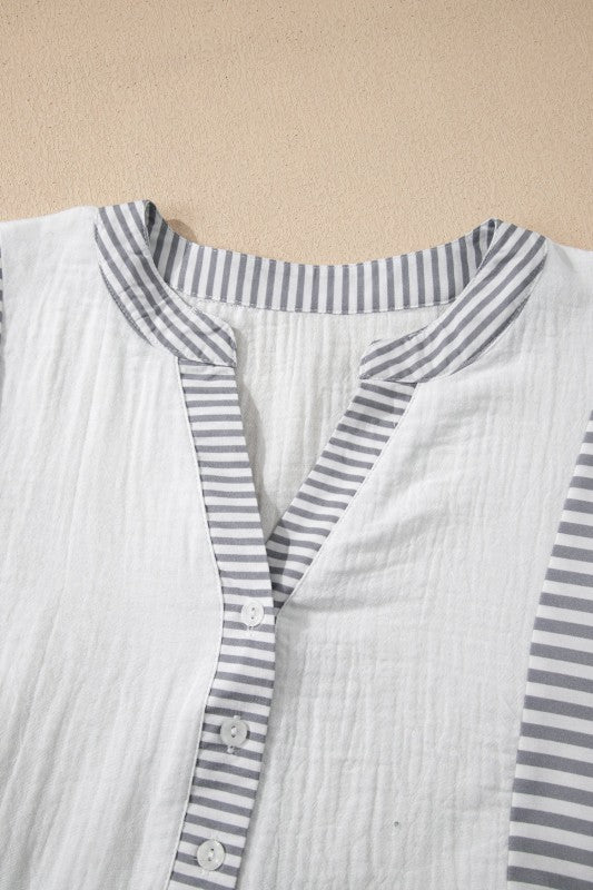 Inject some fun into your everyday style with this charming blouse that's ready to play. Boasting a sophisticated striped palette with eye-catching patchwork details, it features quarter sleeves and a chic split neckline secured with button closures. The relaxed babydoll silhouette keeps things breezy and effortless, making it the ultimate companion for pairing with your go-to denim, skirts, or trousers. Whether you're dressing up or keeping it casual, this versatile piece brings personality and ease to any outfit. 100% Cotton